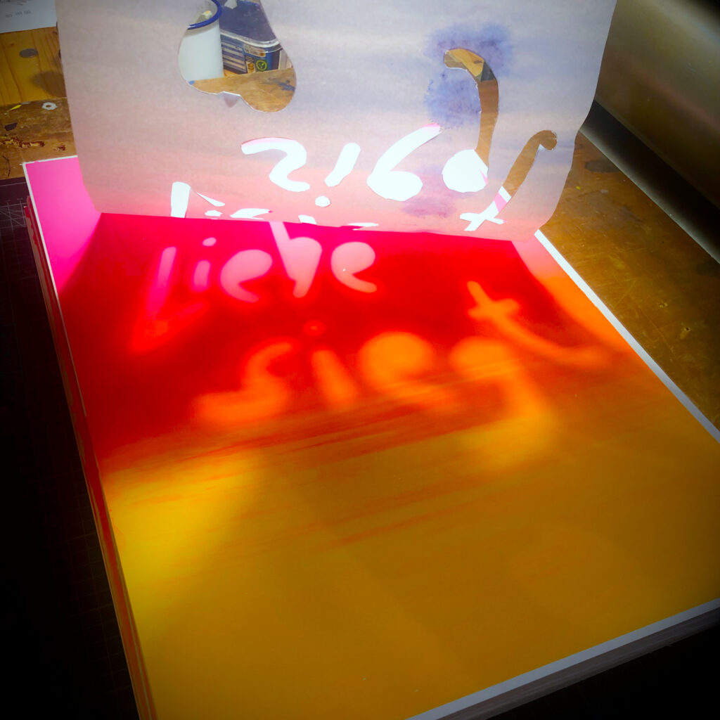 Auch in diesem Jahr machen Frau Müller und Herr Zander wieder eine Siebdruck-Aktion für mehr Liebe und Frieden. Der positive Impuls darf wörtwörtlich in die Welt hinaus getragen werden.